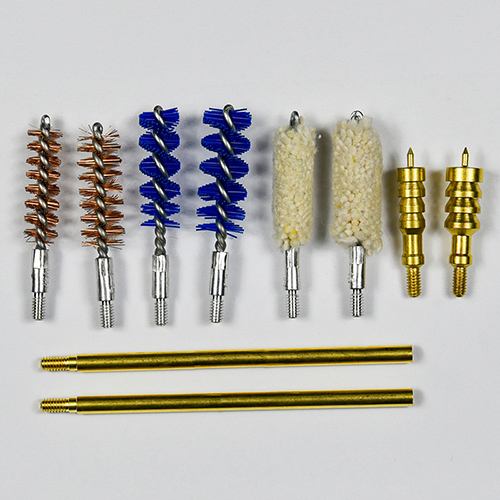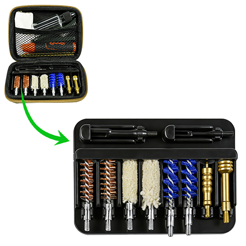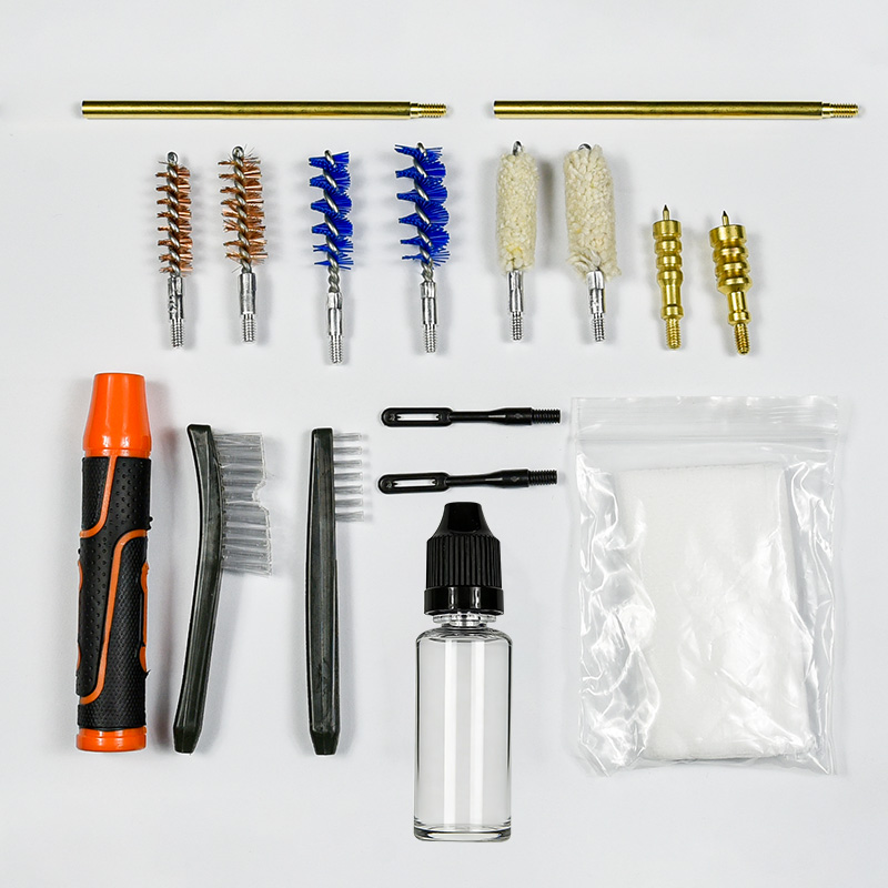 Комплетот за чистење со пиштол вклучува 2 големини (9мм и 0,45 кал.). OX крпа обложена ПВЦ футрола со патент. Месинг четки, памучни џогери, најлонски четки, месинг чаури, 2 прачки. Песоци и црна боја за избор.