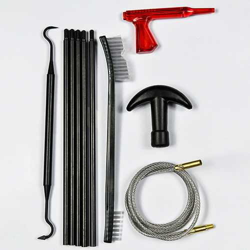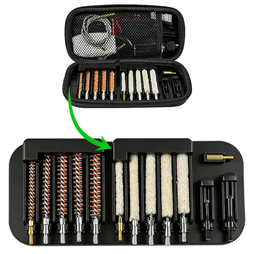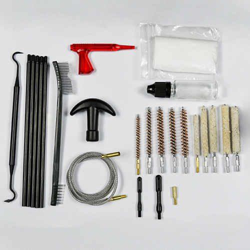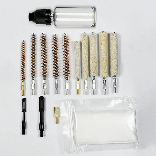 Комплетот за чистење пушка вклучува 5 големини (.177, .22, .243, .27, .30 кал.), месингани четки и памучни џогери, 5 прачки, 2 калби. Песоци и црна боја за избор.
